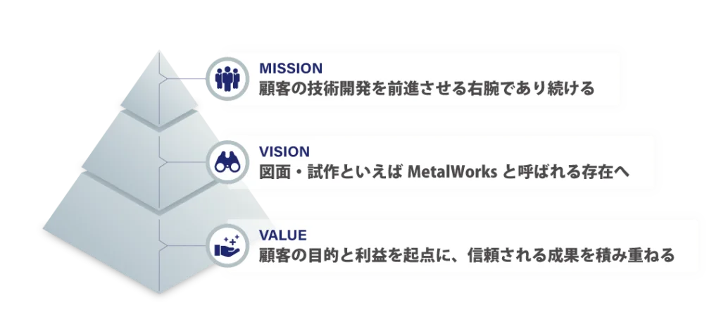 MetalWorksは顧客の利益創出に直結する研究開発・機械設計・試作を支援し、【主役ではなく、最も信頼できる右腕】として価値提供をコミットする。